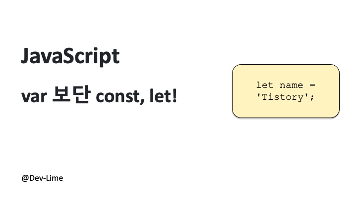 var name= "lime"; | 지양 | 함수 범위, 호이스팅 이슈 있음 |